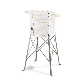 単葉、片屋根式、片開き扉の百葉箱です。本体の内外面は白色の防水塗装を行い、四方側面は通風の良いよろい戸になっています。